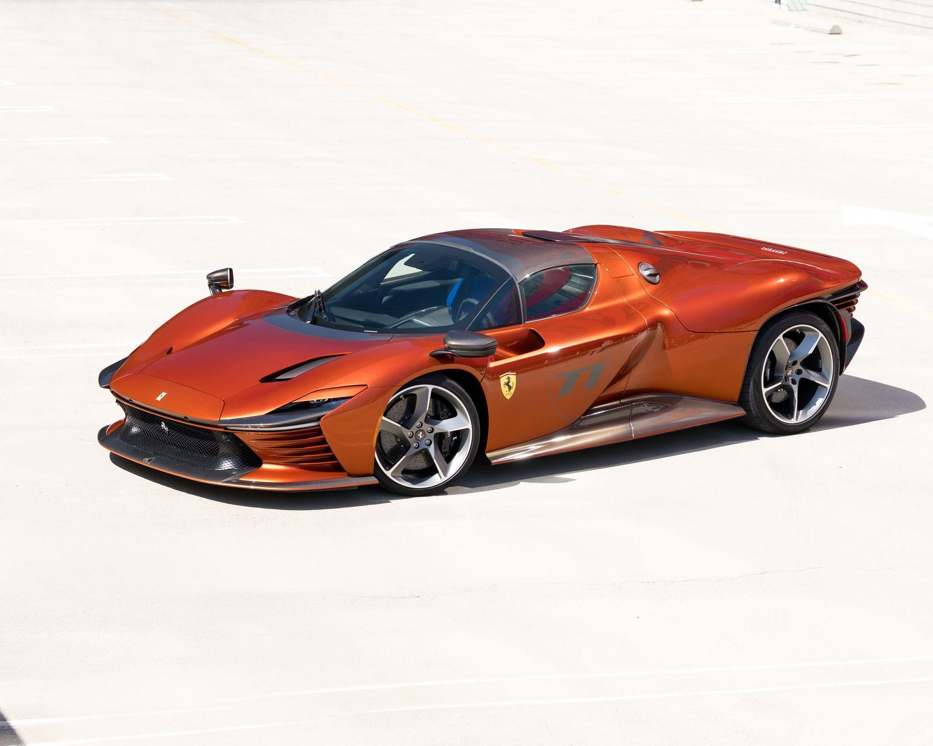 Its vibrant metallic orange paint scheme contrasts beautifully with bronze carbon trim, highlighting other aero-focused car areas. Satin silver-finished forged wheels and black carbon ceramic brake calipers add an extra subtle touch. Its vibrancy continues into the cabin with an interior design combining lightweight carbon fiber and square-stitched Blue Alcantara bucket seats. A special Ferrari Tailor Made plaque is proudly placed between the driver and passenger to commemorate the Daytona SP3 limited-production run as Ferrari’s latest hypercar.